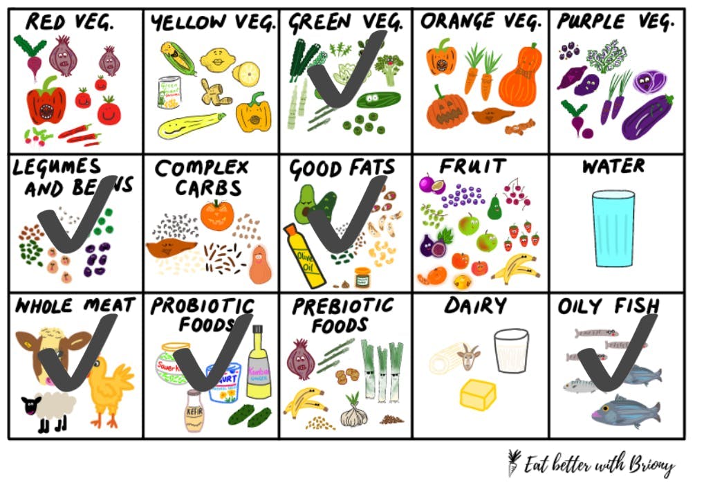 - Healthy fats - nuts/seeds, avocado, olive oil.