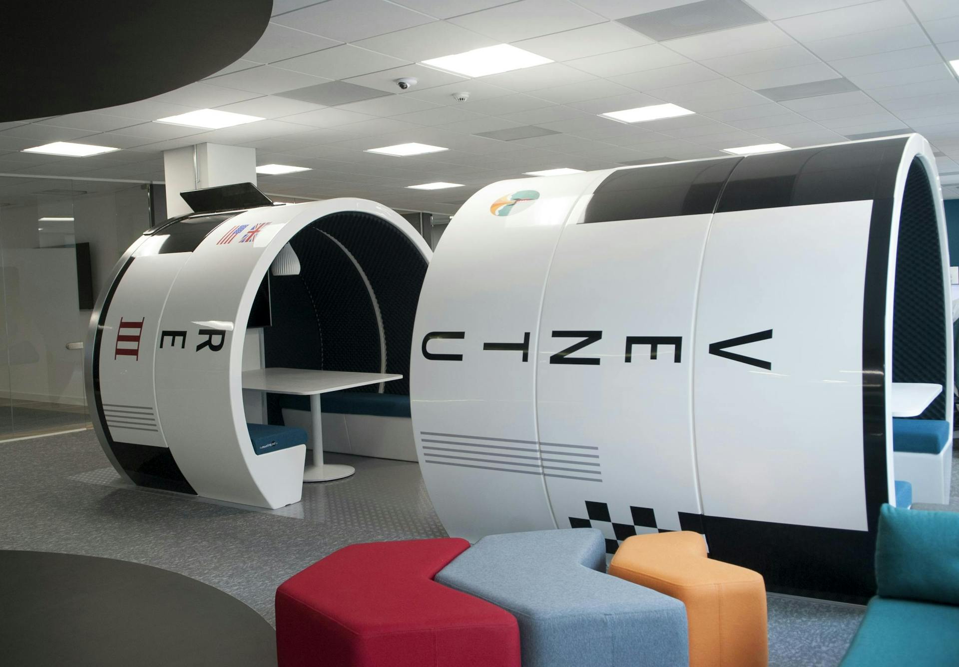In our new office, the design team transformed the meeting pods to make them look like the fuselage of a real rocket. We incorporated some design features from classic NASA rockets as a nod to the founder's original inspiration. We named the rocket "Venture III" for Rocketmaker's third office which you will also see incorporated in a mural at the entrance.