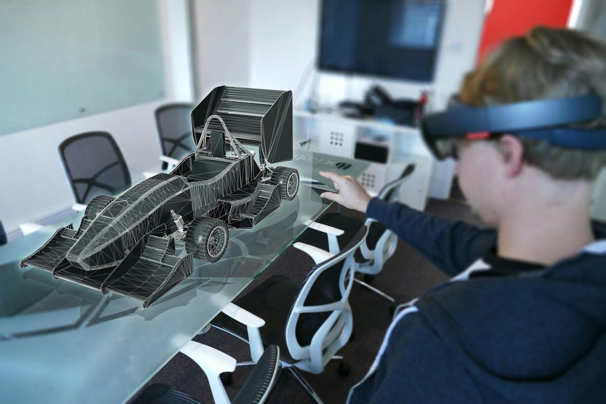 We took this 3D model and developed it into an augmented reality space, where a Microsoft Hololens user could then interact with the car. Using the Hololens, users can select different race car components to analyse aerodynamics, crash impact, manufacturing materials, and structural connections.