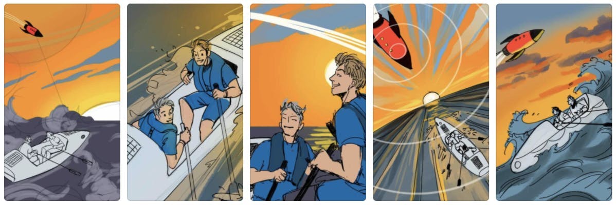 We settled on a couple of compositions that allowed us, with a little creative license, to bring the rocket and boat together, to recreate Guy and David in illustrative form, and to bring a touch of nature and sci-fi alive through the drawing too. With the structure agreed, Lydia moved on to draw out the details.