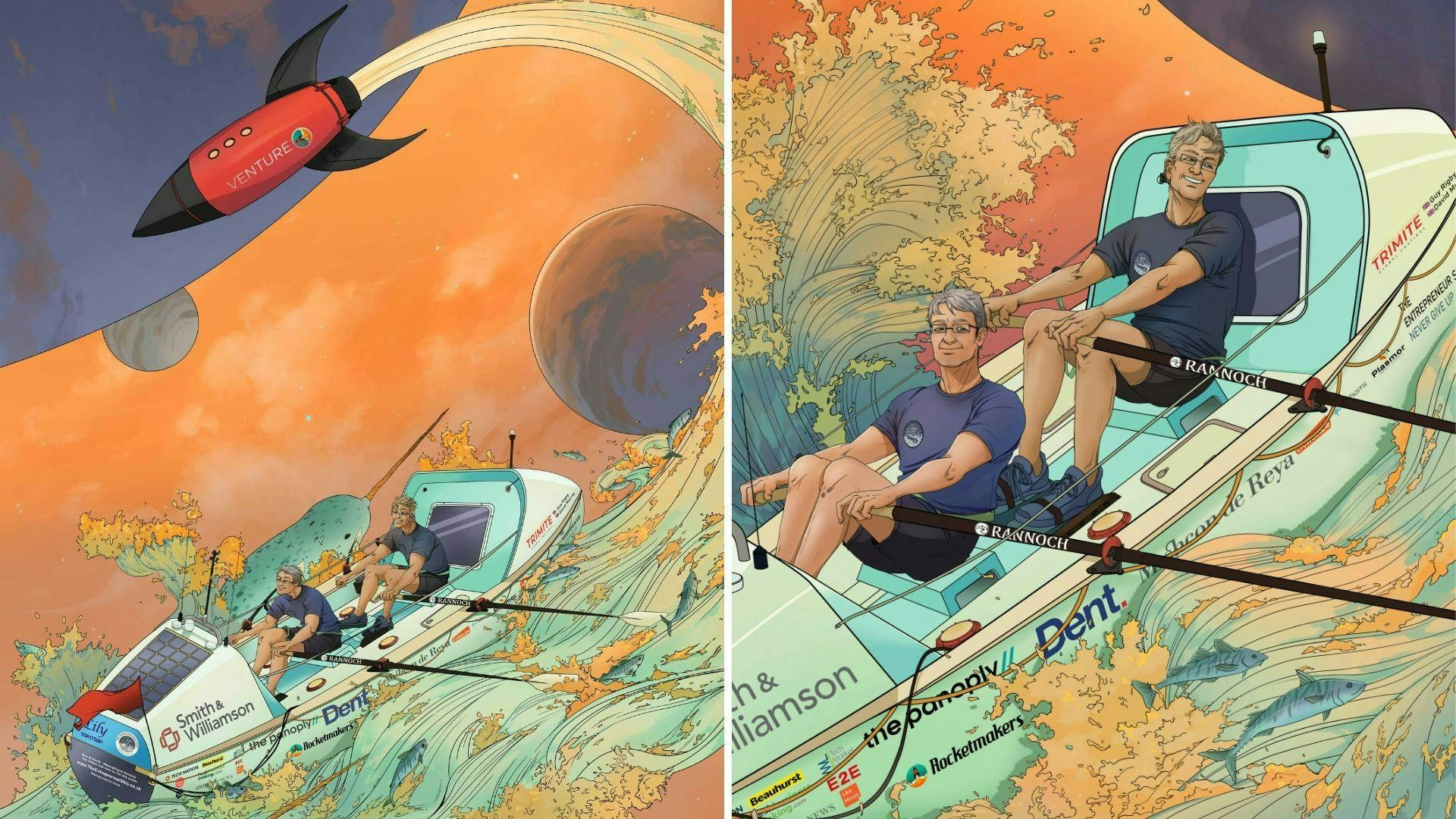 In celebration of our involvement, and of the extraordinary challenge ahead, Rocktmakers commissioned Lydia Cockcroft, our go-to illustrator to create an artwork in celebration of the collaboration. Lydia took our brief and developed some sketches so we could work out how on earth to fit a rocket and a boat in a single frame whilst still making a coherent picture.